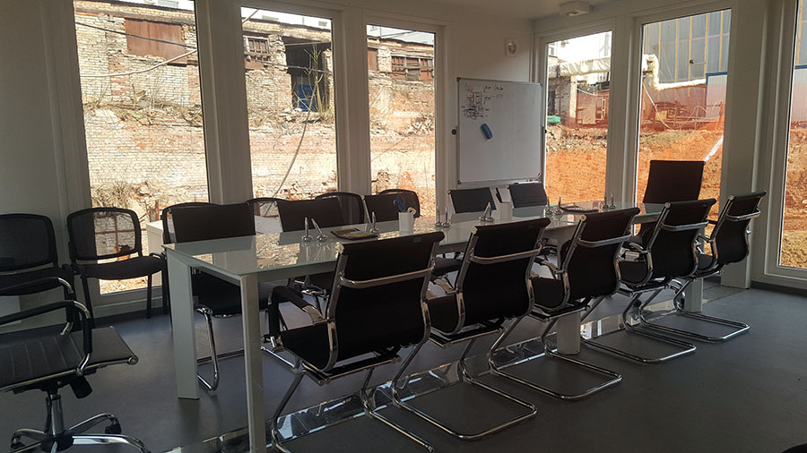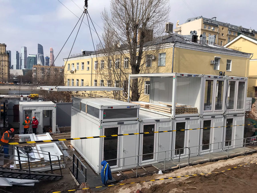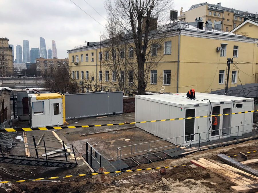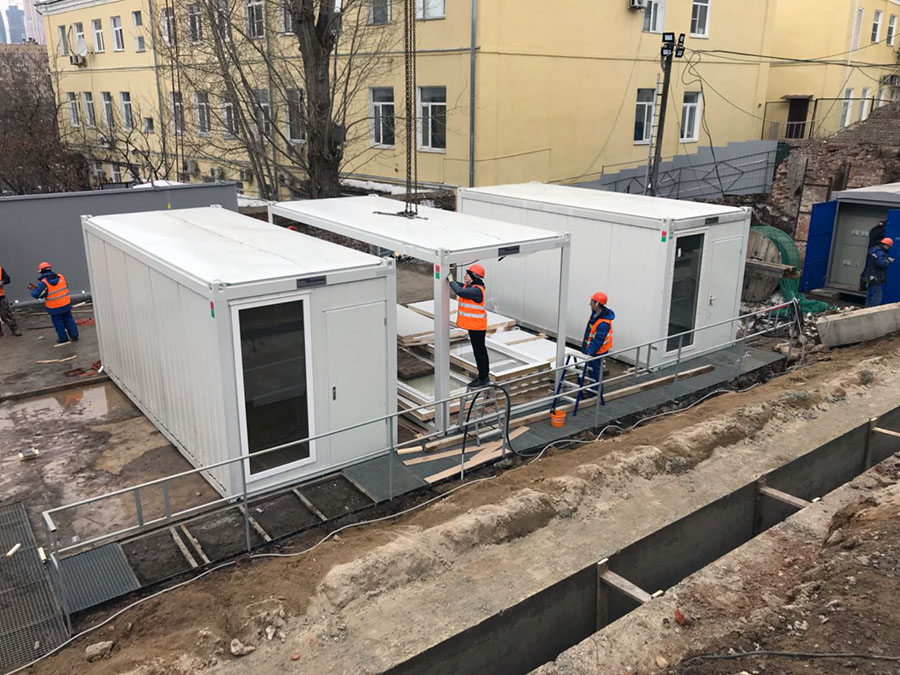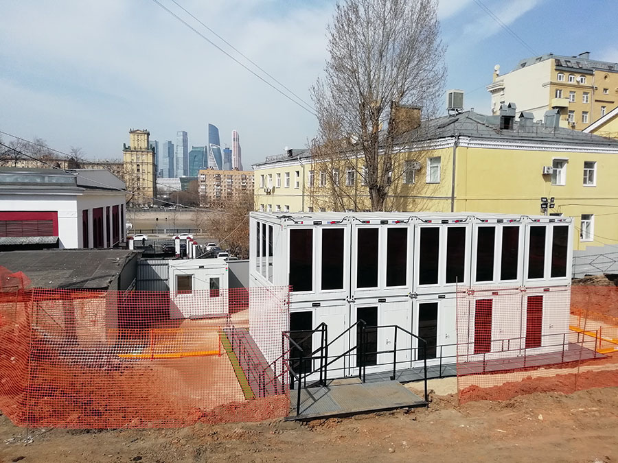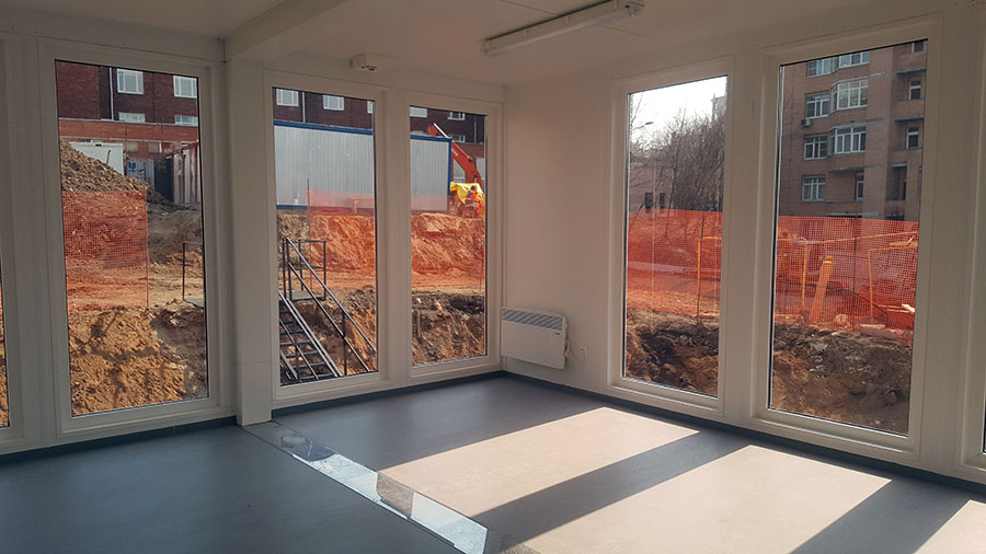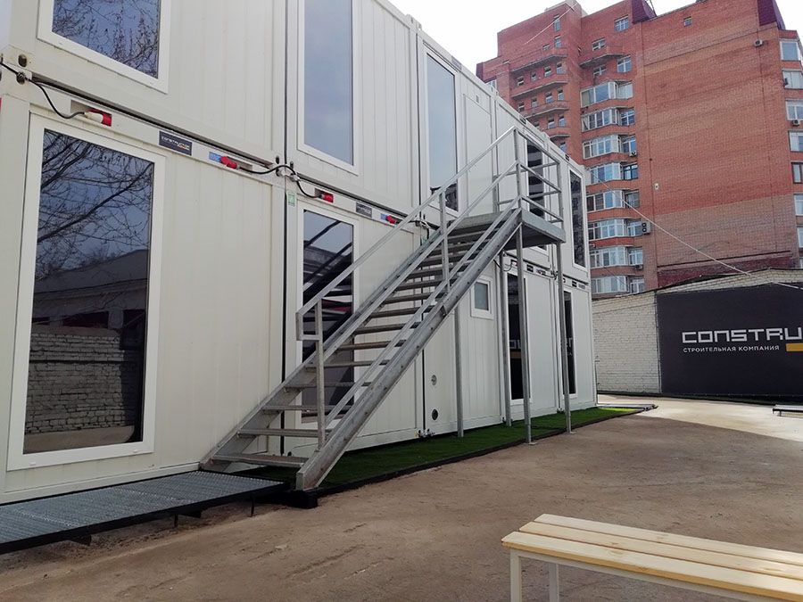 Штаб строительства на базе модулей КОНТЕЙНЕКС с панорамным остеклением, создающий современную и эргономичную среду для эффективного управления проектом и стратегического планирования.